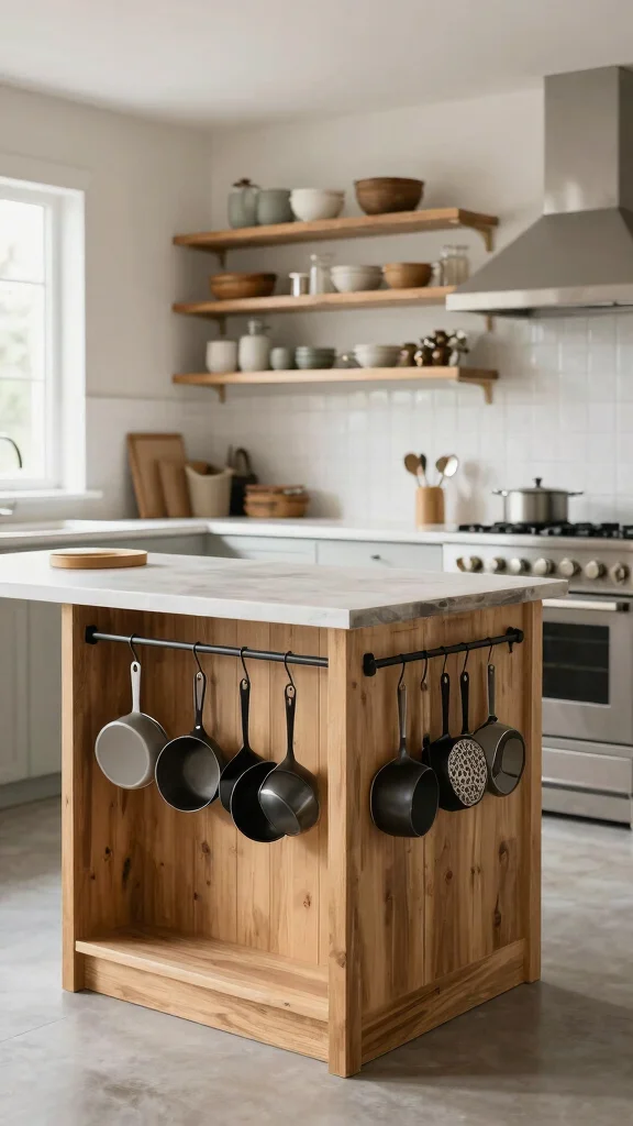Don’t let vertical space go unused! Adding shelves or hooks above your kitchen island can serve as an excellent storage solution.