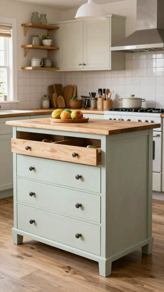 Utilize the drawers for kitchen utensils or other necessities. Creative Tip: Paint or stain the piece to coordinate with your kitchen decor. This not only revitalizes old furniture but also adds a personal touch, embracing sustainable practices in your home improvement journey.