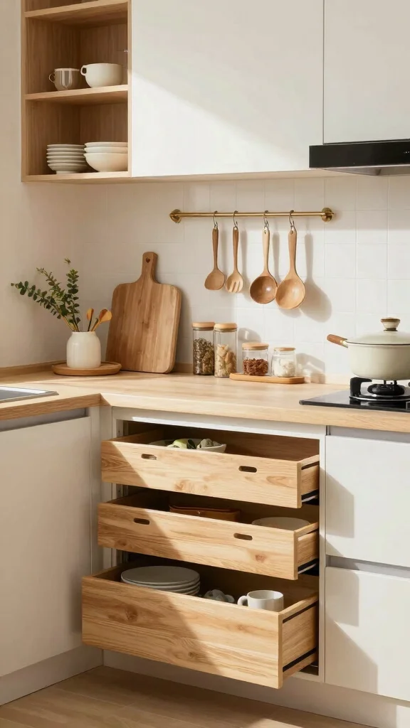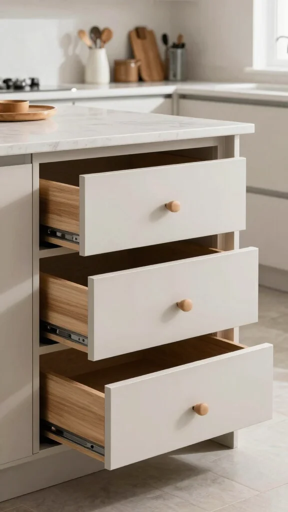 For optimal functionality, consider deep drawers that fully extend, making it easy to find what you need. Adding dividers will help keep everything organized. This small adjustment can significantly enhance your kitchen’s tidiness, especially in compact spaces.