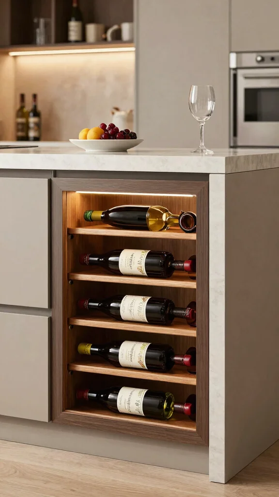 For wine enthusiasts, a built-in wine rack in your kitchen island is a delightful addition. It not only provides a sophisticated touch but also offers a practical way to store your favorite bottles. This clever feature makes use of vertical space, blending seamlessly with your kitchen decor.