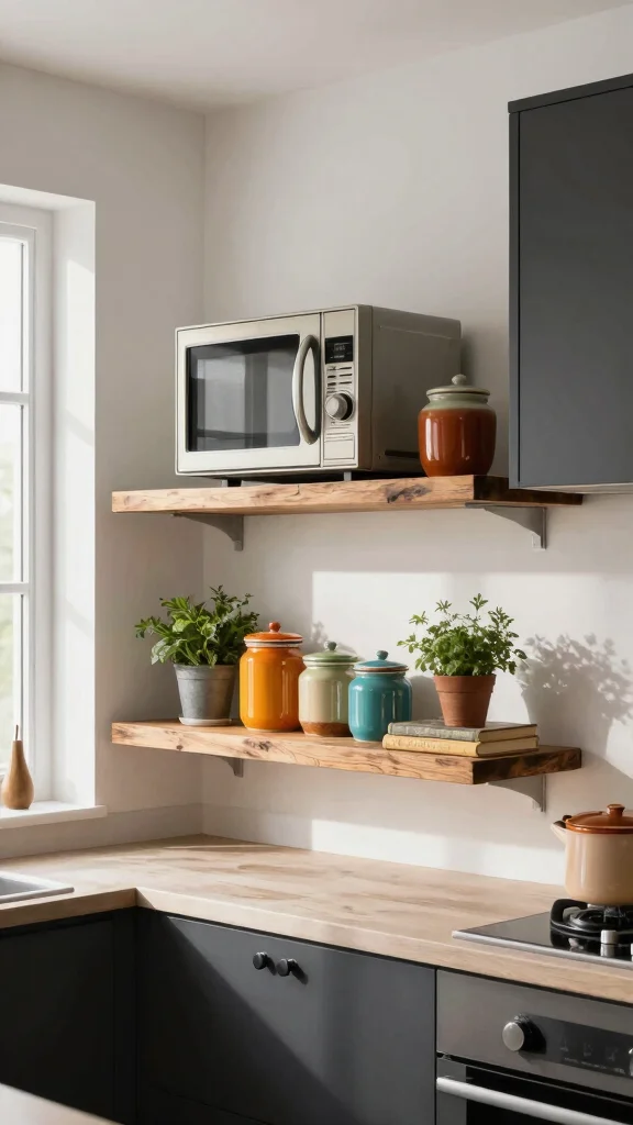 Floating shelves bring a touch of elegance while maximizing vertical space in a small kitchen. With the right materials, like reclaimed wood or sleek metal, they create an inviting atmosphere that balances functionality and style. Imagine showcasing your microwave on a shelf above, leaving your countertops clear for meal prep. Adding personal touches, such as vintage cookbooks or quirky plants, transforms this practical setup into a creative expression of your personality.
