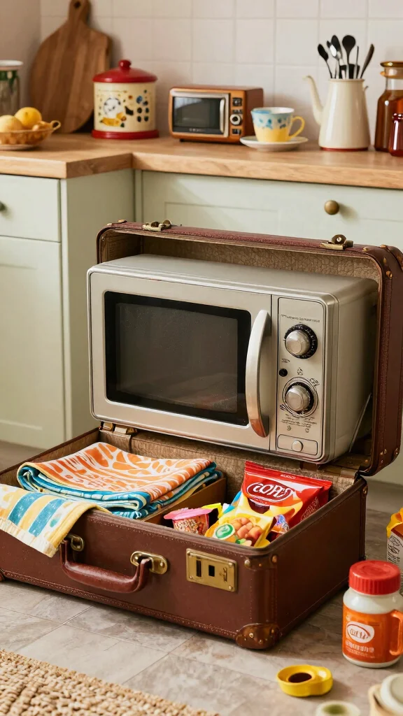 Transforming an old suitcase into a unique storage piece for your microwave can add character to your kitchen. By placing your microwave atop an open suitcase, you create a fun focal point while utilizing the inside for additional kitchen items. This retro look showcases your eclectic taste and offers a charming solution for storage. Perfect for garage sale finds, vibrant suitcases can hold snacks, utensils, or table linens for a practical yet stylish option.