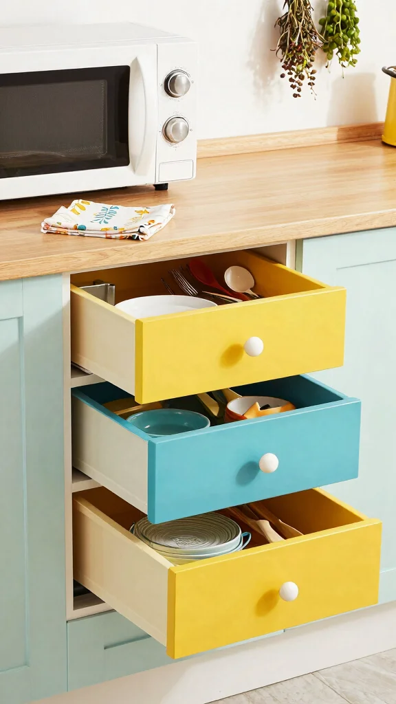 Organizing your microwave area with colorful drawer dividers can make your kitchen feel more put together. Use these dividers to neatly arrange utensils or cooking tools in designated drawers, making them easy to find when needed. Opt for vibrant colors or fun patterns to enhance your kitchen’s eclectic vibe while making organization enjoyable. Labeling each section can further streamline your cooking process and add a playful touch.