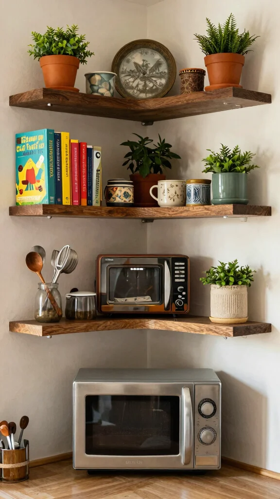 Installing corner shelves is an innovative way to make the most of unused space in your kitchen. These shelves can hold your microwave and other essentials, ensuring easy access while maximizing storage. Choose from various materials, such as wood or metal, to align with your eclectic decor style. Decorate the shelves with vintage items, cookbooks, or small plants to add a personal touch that elevates your kitchen’s design.