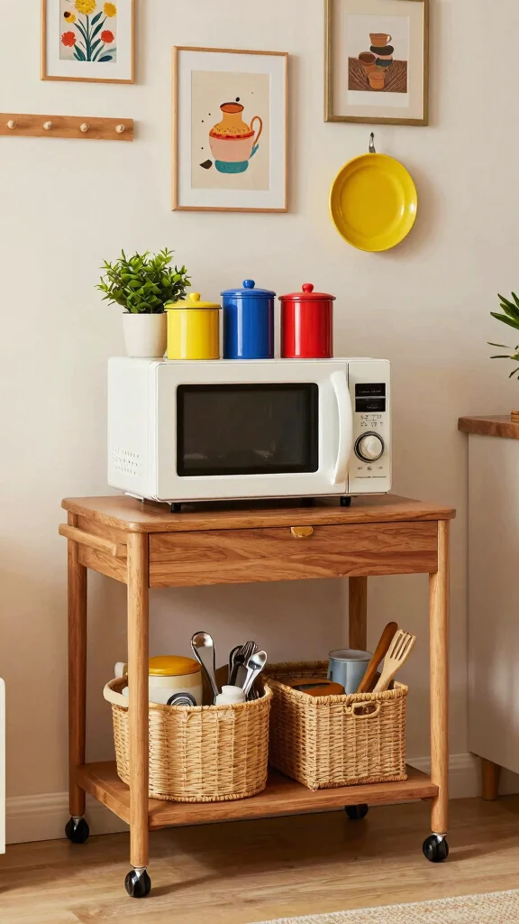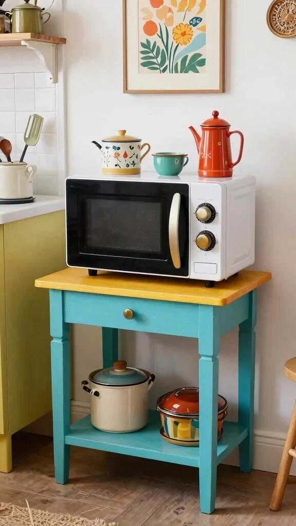 This multi-functional cart not only serves as a microwave stand but also contributes to the overall aesthetic of your kitchen. Look for budget-friendly options at thrift stores or online marketplaces that fit your eclectic style while providing essential storage.