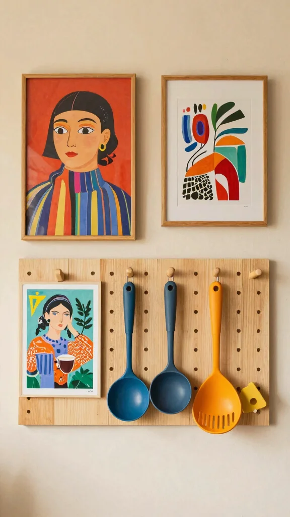 Incorporating wall art as a functional storage solution can elevate your kitchen’s design! Use pegboards, clipboards, or magnetic boards to display artwork alongside kitchen tools or small cooking essentials. This creative approach adds a personal touch while ensuring everything stays organized. Choose artistic pieces that resonate with your eclectic style, featuring bold colors and unique designs that enhance your kitchen’s visual appeal.