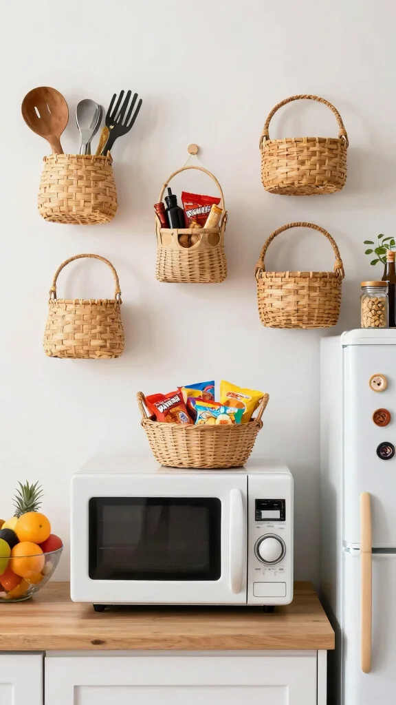 Baskets offer a stylish and functional way to organize your kitchen around the microwave. Position a small basket on top to hold snacks or utensils you frequently use. Alternatively, hanging basket organizers on the wall keeps your countertops clutter-free while adding a rustic charm. By mixing sizes and textures, you can create a visually interesting display that adds depth to your kitchen decor.
