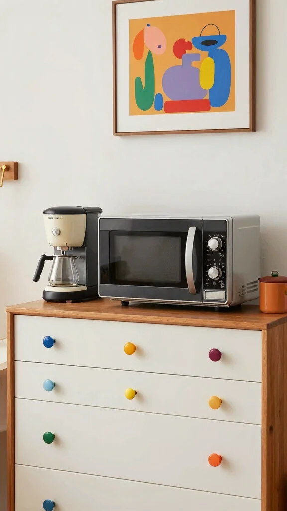 Consider a pull-out pantry or a shallow cabinet with a dedicated microwave slot to keep cords managed and airflow open. To blend with an eclectic vibe, pair retro finds with timeless pieces on the surrounding storage so the setup feels cohesive rather than cluttered.