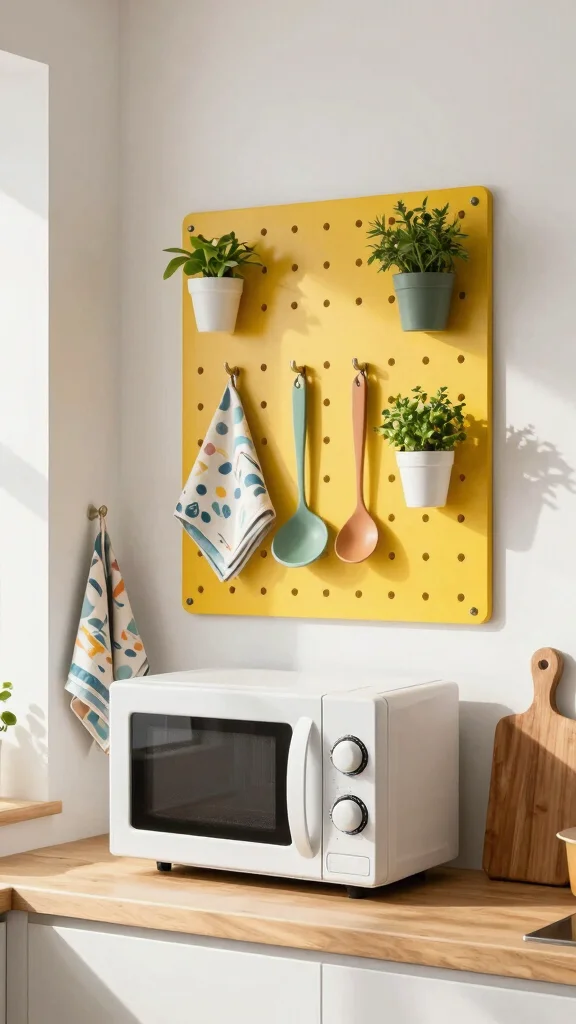 Pegboards are versatile and can be creatively used for storage in your kitchen. Install a pegboard near your microwave to hang utensils, measuring cups, and even small pots. This approach keeps everything accessible while introducing a unique visual element to your decor. Paint the pegboard to match your kitchen palette or leave it in a natural wood finish for a rustic vibe, tailoring it to your eclectic style.