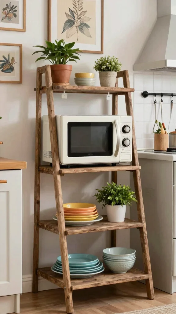 A vintage ladder can become a quirky shelving unit in your kitchen. Leaning a wooden ladder against the wall allows you to display your microwave along with decorative items. This not only adds height but also showcases your eclectic style, turning a simple ladder into a statement piece. Fill it with colorful dishware, herbs, or a vintage clock to create a charming look.