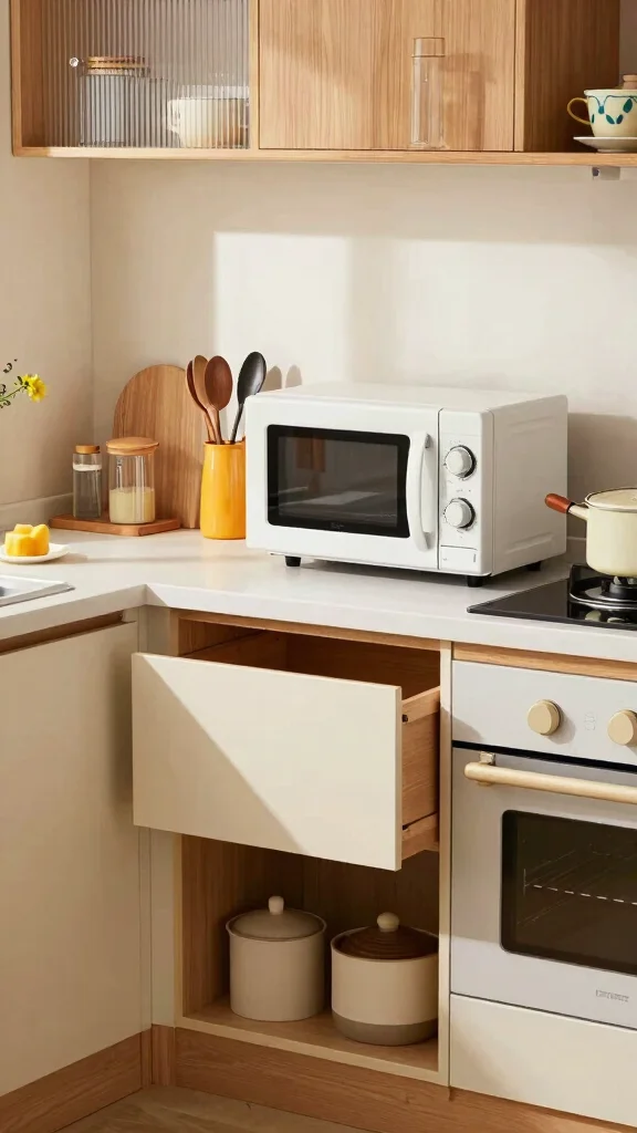 Fun fact: microwave storage ideas small kitchen shine when you hide the microwave in wall-mounted cabinets—frees counter space and sparks eclectic style. Pro tips: choose glass-front or vintage cabinets to showcase character while keeping functionality.