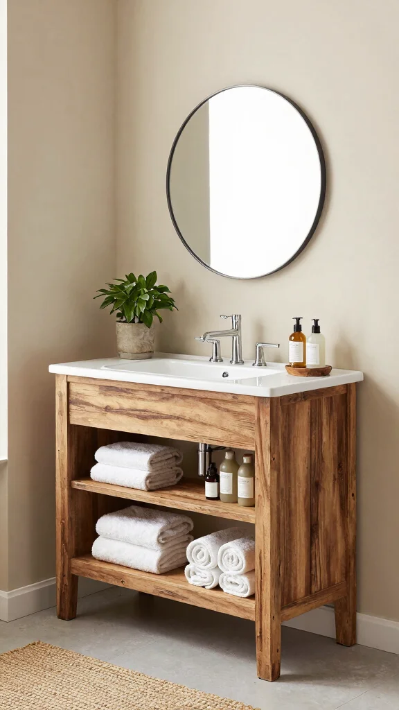 To fully embrace this style, consider the practical aspects of storage and accessibility. Opt for designs that feature open shelving and drawers to keep your essentials organized while displaying decorative touches. You can find reclaimed wood vanities at local artisan markets or online marketplaces, offering a budget-friendly way to incorporate sustainable materials into your home.