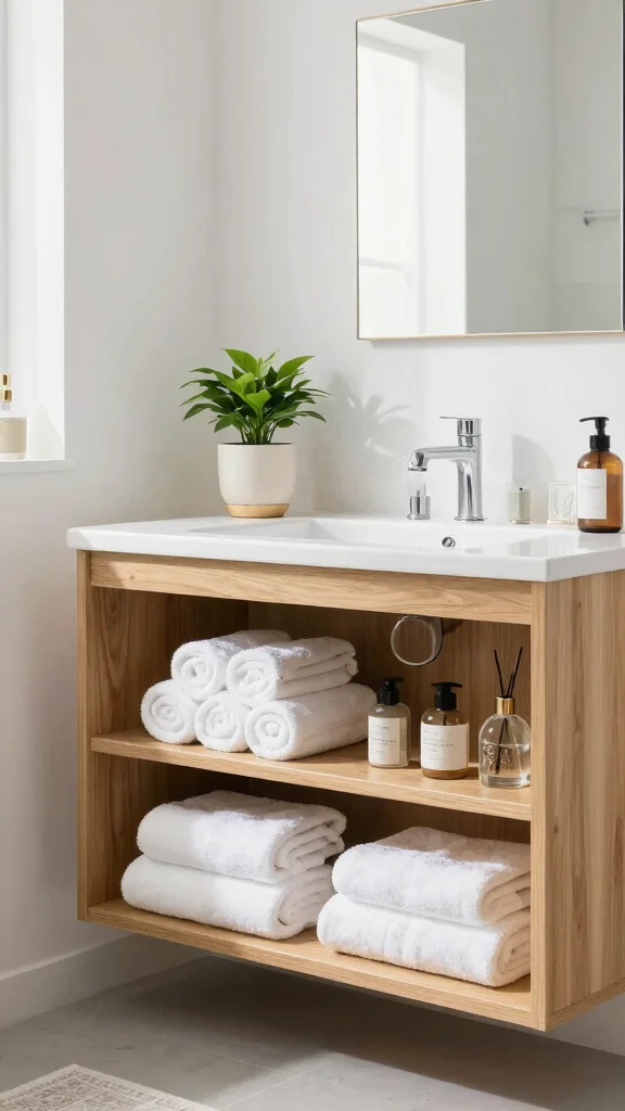 Incorporating open shelving into your bathroom vanity design allows for creativity and style while ensuring everything stays within reach.
