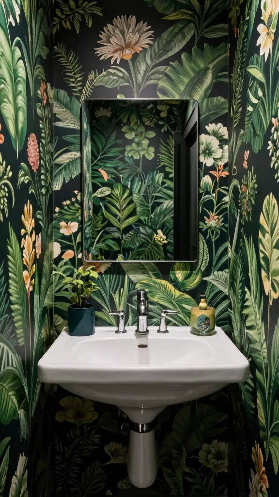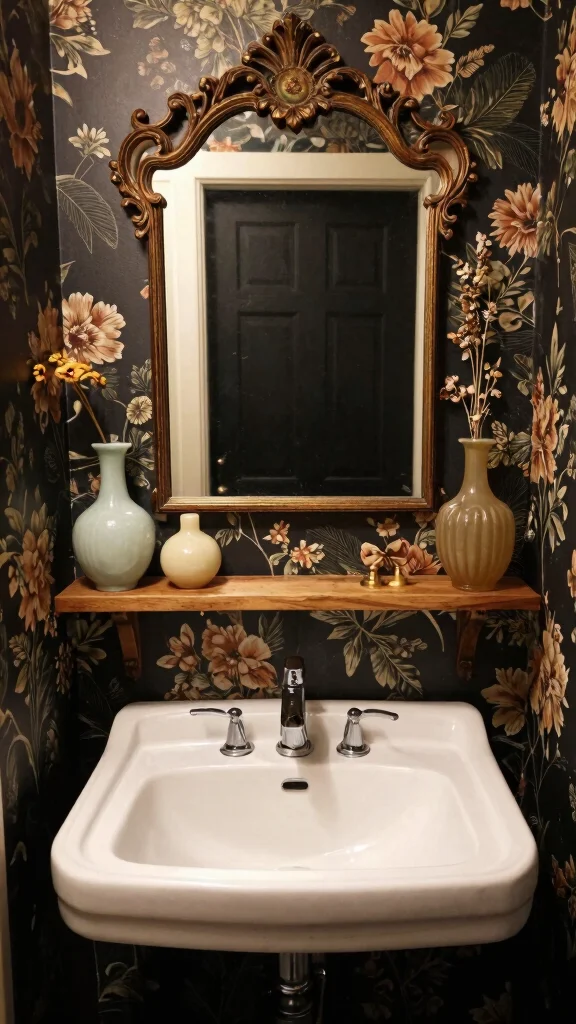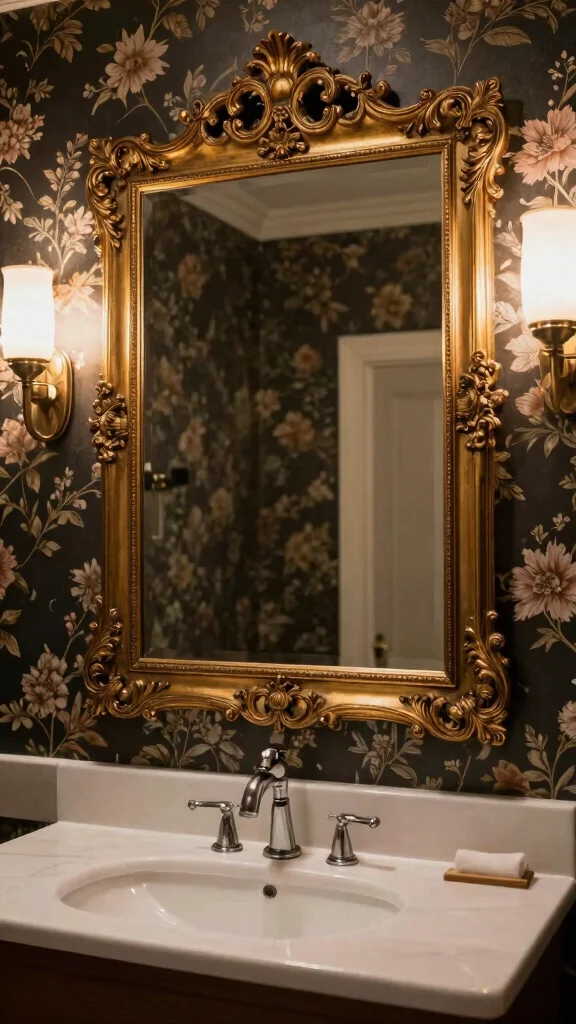Dramatic mirrors can serve as both functional pieces and artistic statements. Choose mirrors with ornate frames or unique shapes that complement your theme. A large mirror can also create an illusion of space, making your powder room feel larger despite its small size. Position the mirror strategically to reflect light and enhance the floral details within the room.