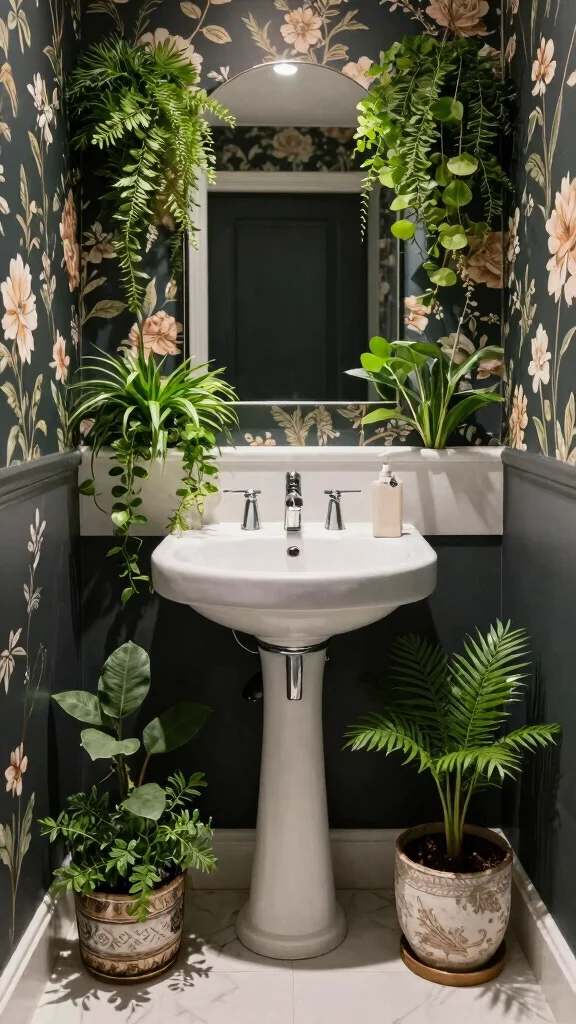 With graceful plant life, your powder room becomes a serene retreat that blends style with nature.