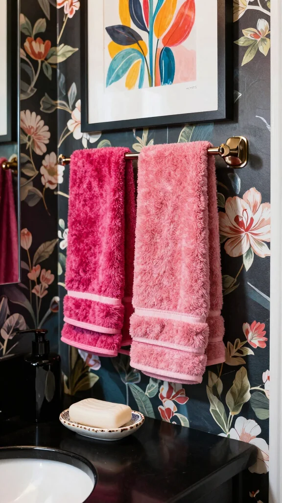 Investing in luxurious textiles can significantly elevate your powder room’s vibe. Think plush towels, elegant curtains, or soft bath mats that harmonize with your dark floral theme. Rich materials like velvet or silk add opulence and warmth to the space.