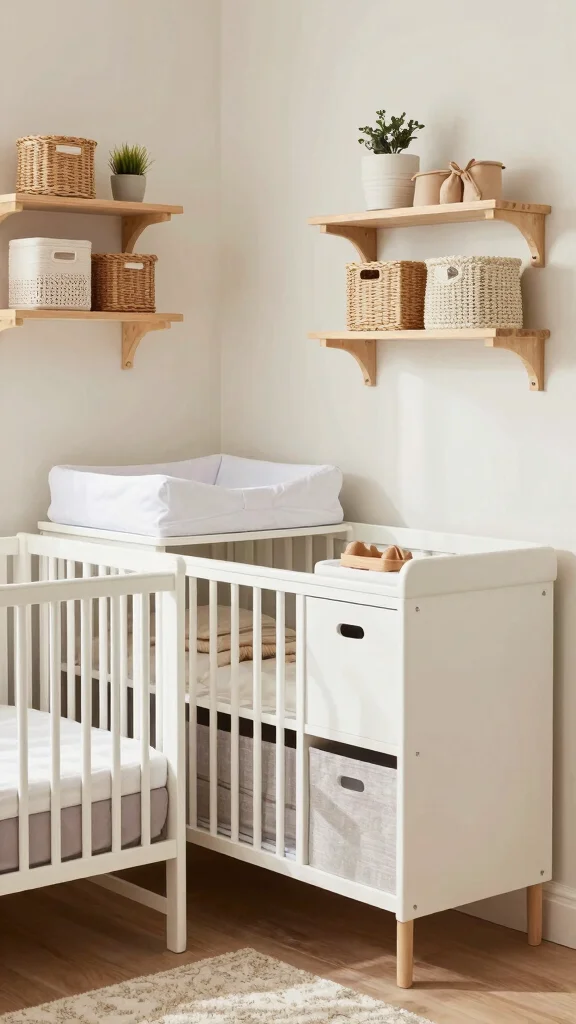 Add a few functional pieces—under-bed storage, a book ledge, and a changing station with hidden storage—so the room stays tidy as your baby grows.
