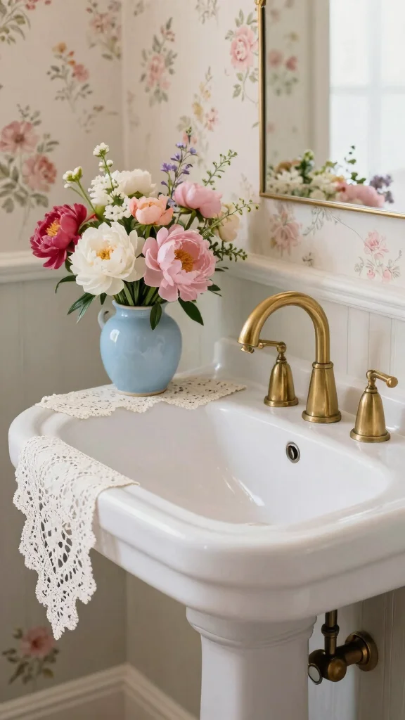 Incorporate floral elements like vases or wallpaper for a fresh, vintage-inspired vibe in your powder room.