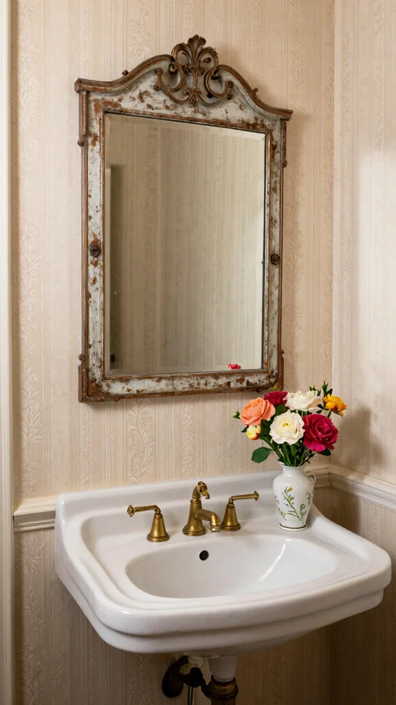 Which decorative mirrors work best in a vintage-inspired powder room for depth and character?