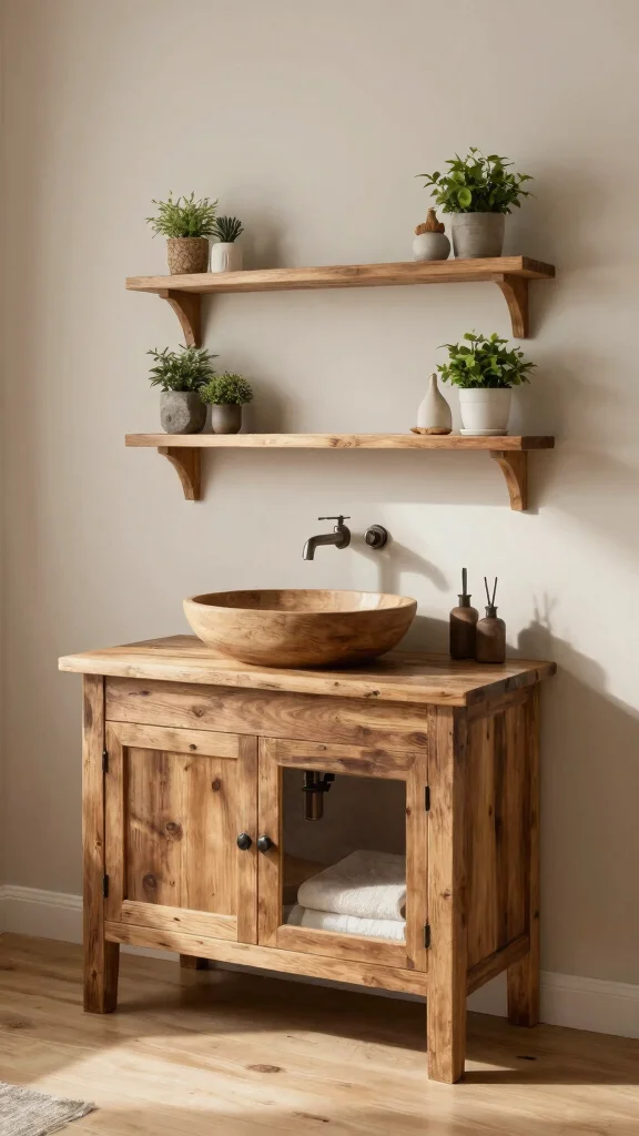 A rustic wood vanity instantly infuses warmth and personality into your small bathroom. Imagine a design crafted from reclaimed barn wood, beautifully merging style with sustainability. This not only acts as a captivating centerpiece but also offers practical storage solutions with minimalist shelving options.