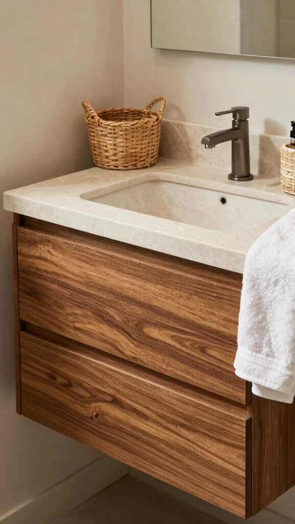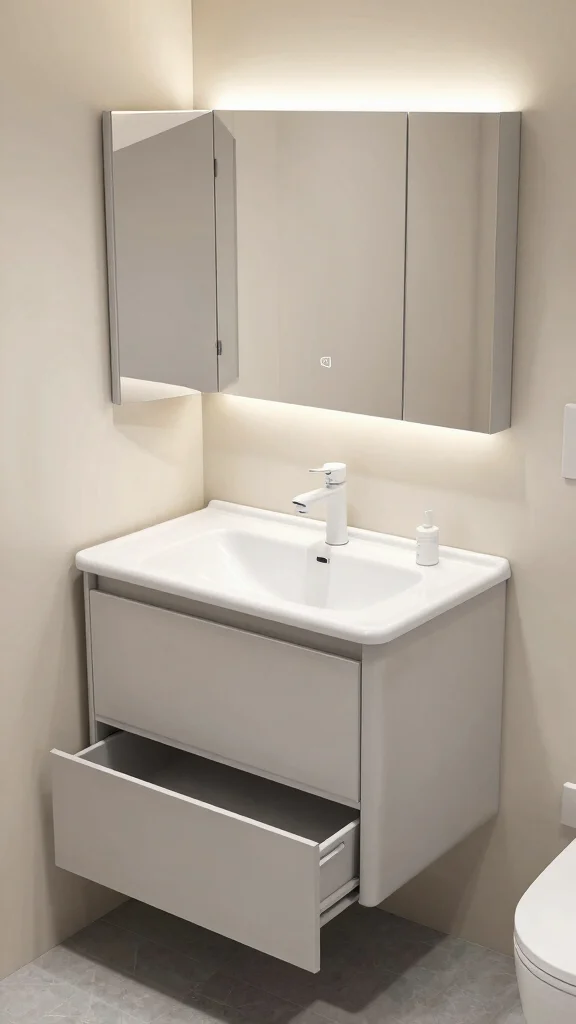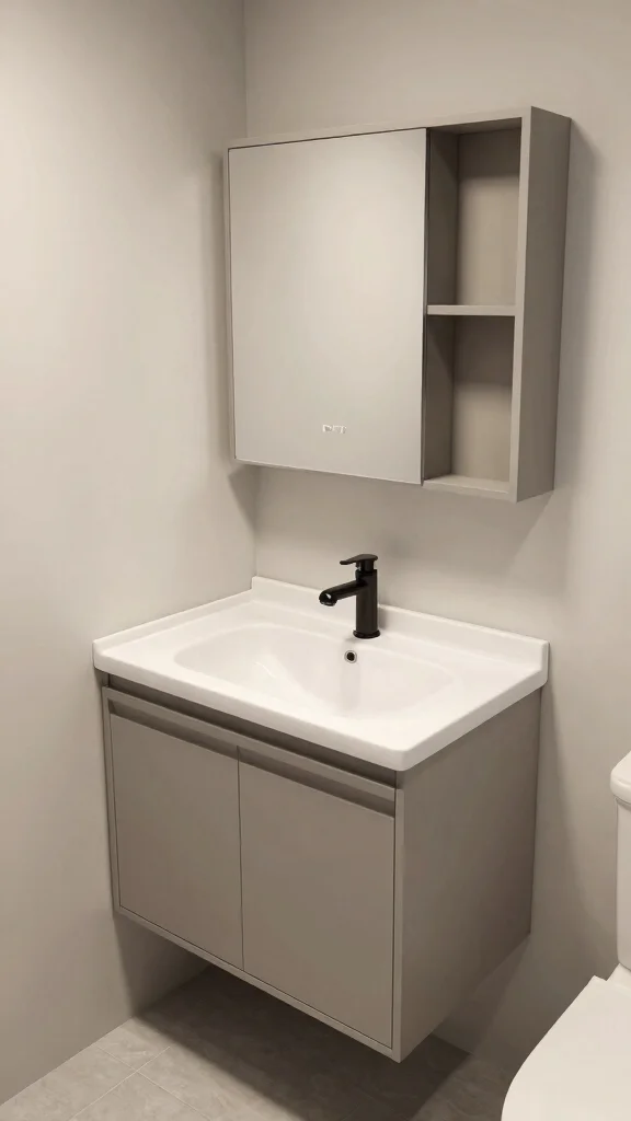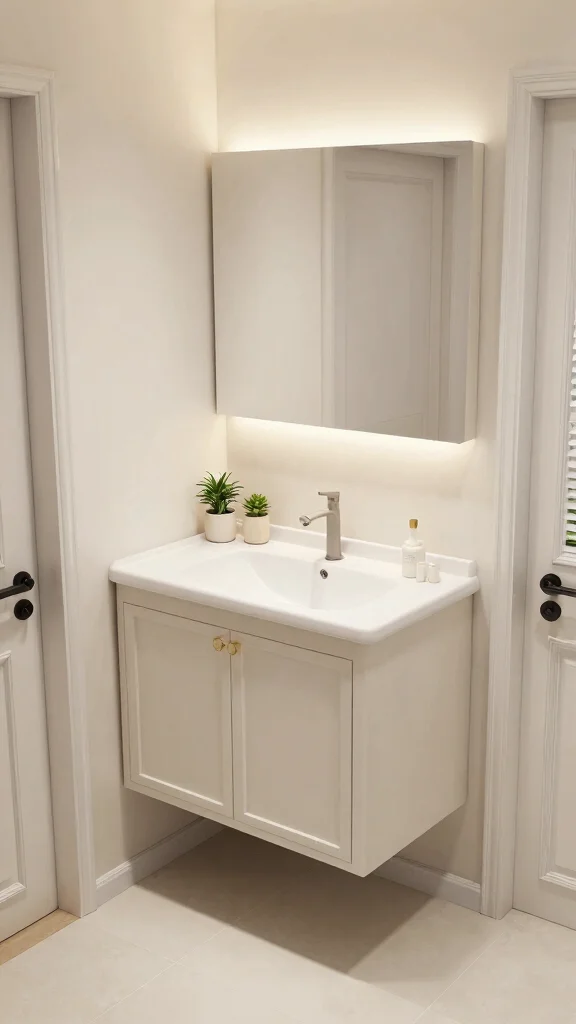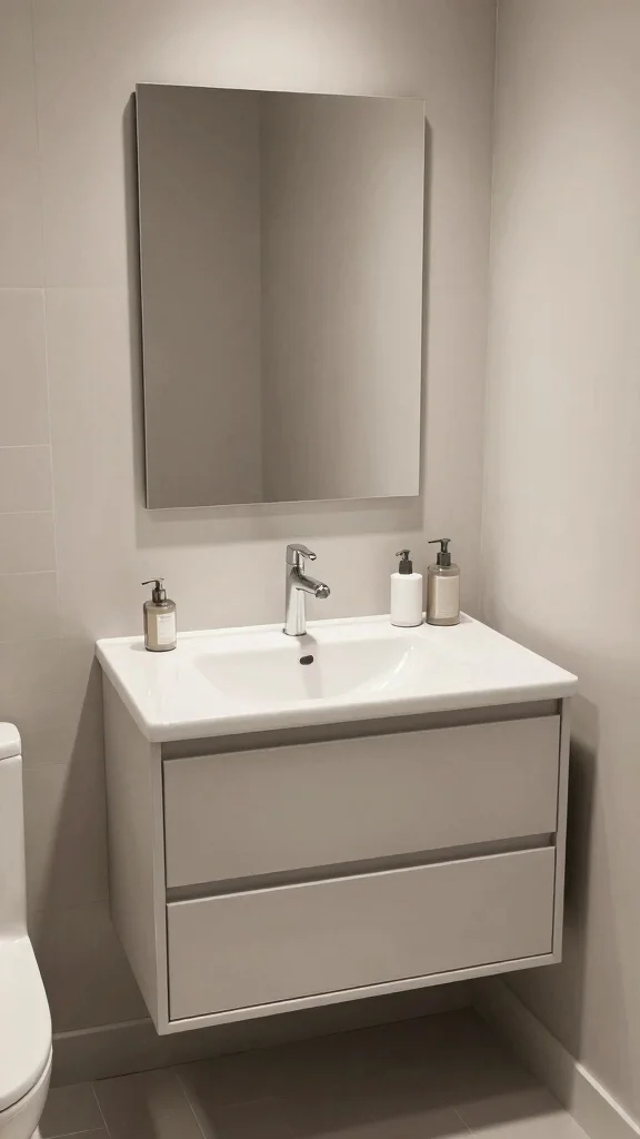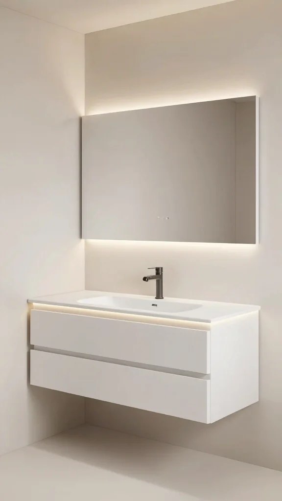 Opt for a sleek design featuring a single sink and streamlined storage solutions. Keeping the color palette light and airy is essential. Pair this with a large mirror to further enhance the open feel of your bathroom. Subtle lighting beneath the vanity can create a warm glow, highlighting the floating effect.
