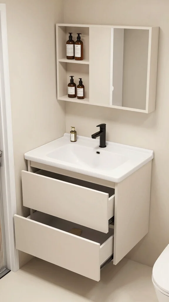 Incorporating pull-out drawers can facilitate quick access to toiletries and towels, making your daily routine more efficient. Additionally, consider using the space above the vanity or on the mirror with floating shelves for extra storage without consuming floor space.