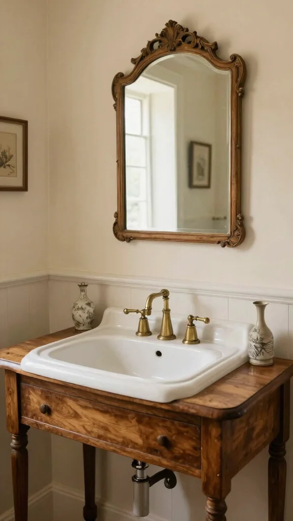 You can achieve this look by placing a stylish washbasin atop a vintage-style table or chest. Complement it with aged brass or chrome fixtures for that authentic vintage touch. Adding a decorative mirror and vintage accessories can amplify the character of the space while maintaining a cohesive aesthetic.