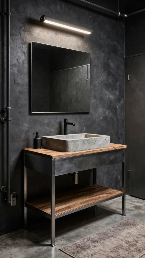 Keep the color palette muted with dark grays and blacks for an edgy atmosphere. Pair it with exposed pipes and metal accents to solidify the industrial look. Compact storage solutions, like built-in shelves or cabinets, will help keep your small bathroom organized while maintaining style.