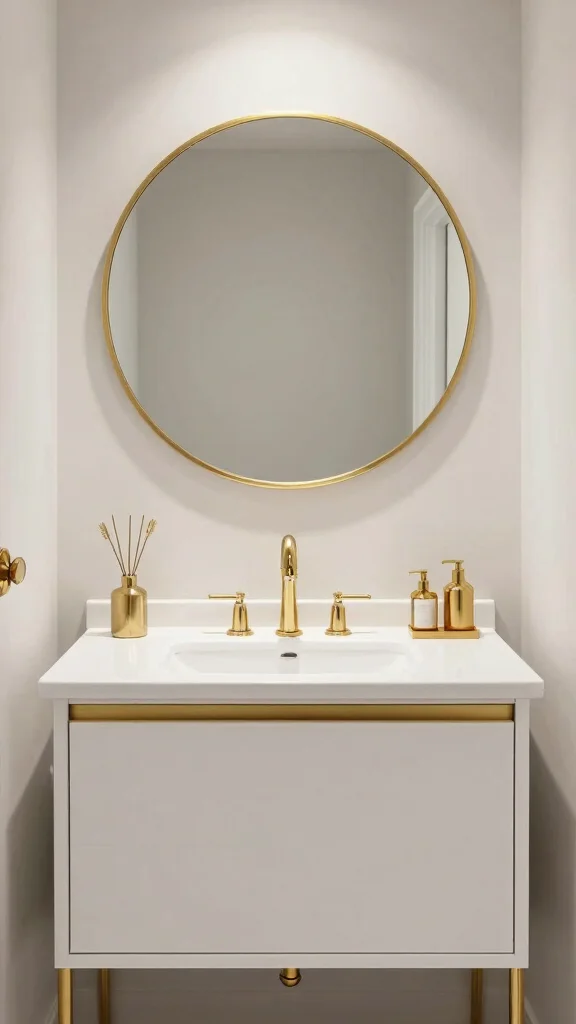 Incorporating gold finishes on knobs and faucets provides a lavish feel that enhances the overall aesthetic. Consider a sleek white or dark vanity to create a striking contrast against the gold elements. A round mirror featuring a gold frame can further emphasize this stunning theme while illuminating the room.