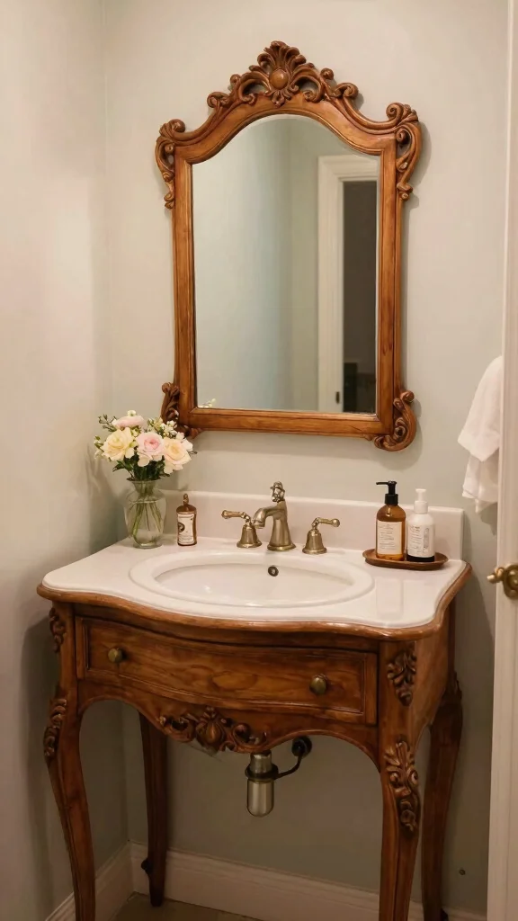 When selecting a vintage vanity, consider models with a smaller footprint that won’t overwhelm your space. You might also think about refinishing it to coordinate with your existing color palette, making it a true reflection of your style. This aligns with a trend toward personalized, character-filled spaces.