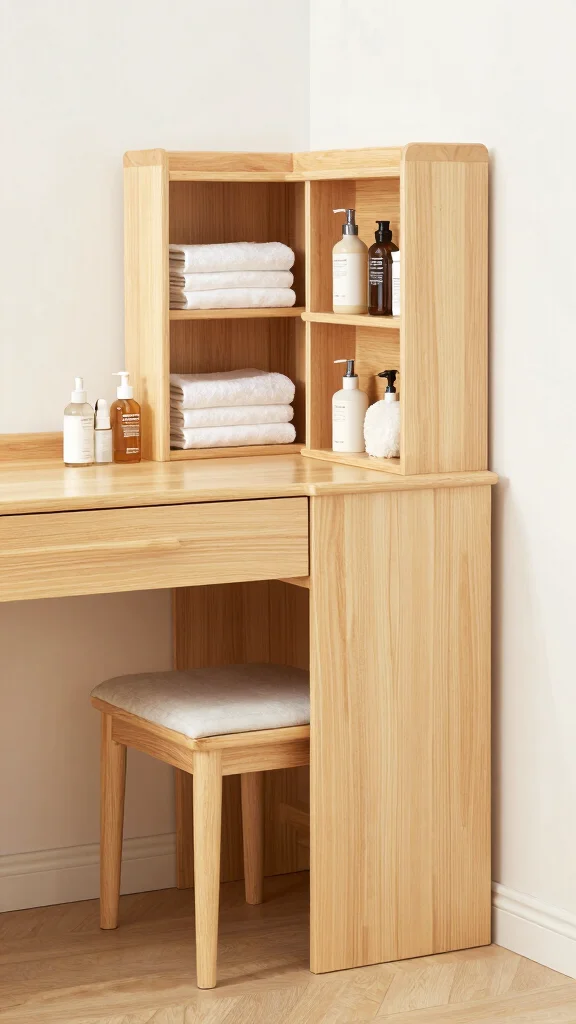 To implement this space-saving approach, look for corner vanities with creative storage options that fit your layout. You can find budget-friendly models made from laminate or MDF that still provide a chic look. This choice connects to broader trends emphasizing function without sacrificing style.