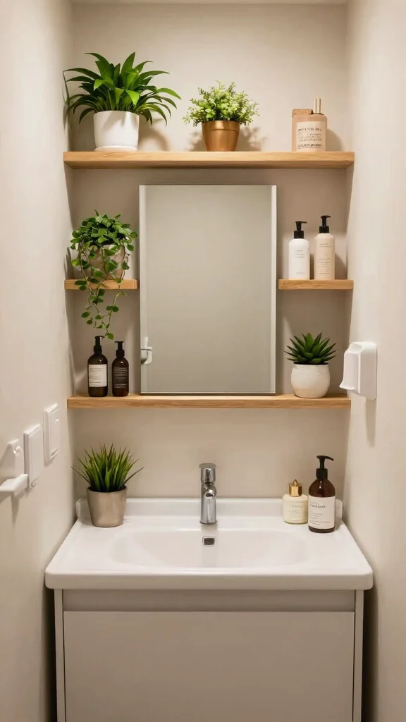 Wall-mounted shelving enhances both storage and style, making it a smart addition to your small bathroom.