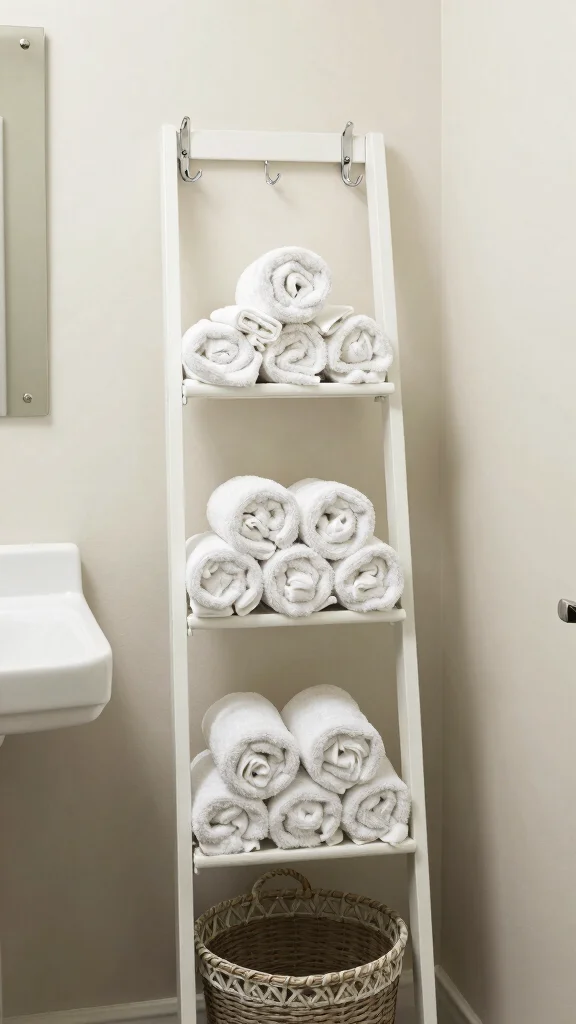 Installing hooks on the wall saves space and keeps towels easily accessible. A slim ladder shelf can hold towels while adding style, making it perfect for narrow layouts. Consider a decorative basket under the sink for rolled towels, ensuring they are easy to grab when needed. A stylish towel rack can serve as both decor and storage, enhancing your space’s aesthetic.