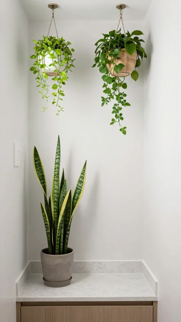 Choose low-light plants such as snake plants or pothos, which thrive in less light, making them ideal for powder rooms. Attractive small planters can be placed on shelves or counters to complement your decor. Hanging plants save space while introducing greenery at various levels, and if maintenance is a concern, stylish faux plants can provide the same aesthetic without upkeep.