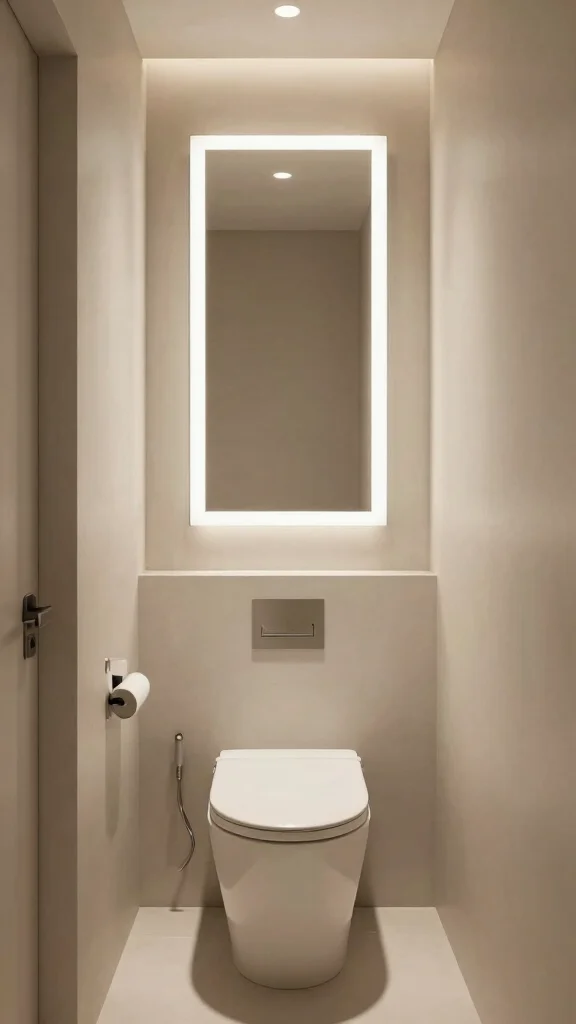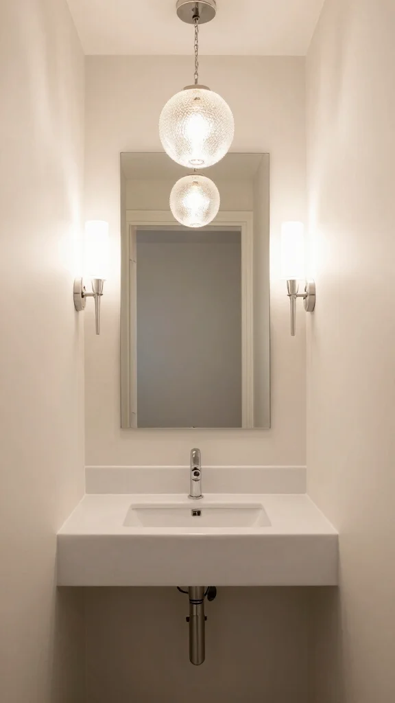 Layer your lighting: a slim overhead fixture plus wall sconces on either side of the mirror, or a vertical LED strip behind the mirror, to brighten every corner. Choose daylight or bright neutral bulbs to bounce light off light-colored walls. Use mirrors strategically to reflect light and create depth, and consider gloss finishes to amplify brightness. These small space solutions support a narrow bathroom design and make your powder room feel more open. Add a touch of powder room decor with minimal accessories.