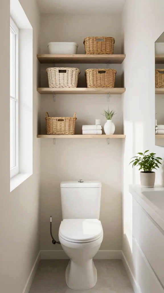 Consider installing floating shelves above the toilet or sink to hold decor or toiletries stylishly. Incorporating baskets can streamline the look while hiding away extra items, adding a touch of charm. Corner shelving is great for utilizing overlooked areas and adds unique shapes to your design.