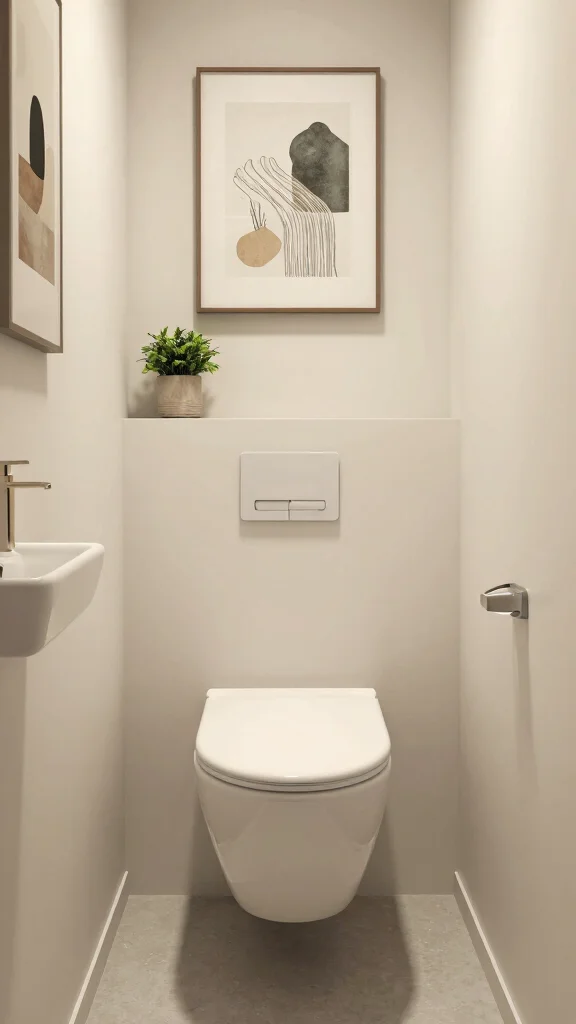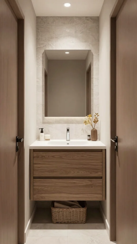 Prioritize wall-mounted fixtures: a wall-mounted toilet and a compact or corner sink to save floor space. Add a pocket or sliding door to keep door swing from crowding the room. Choose a vanity with integrated storage or a floating shelf for essentials, and consider a continuous countertop to minimize visual breaks. These choices align with compact powder room design and narrow bathroom design principles, delivering function without clutter.