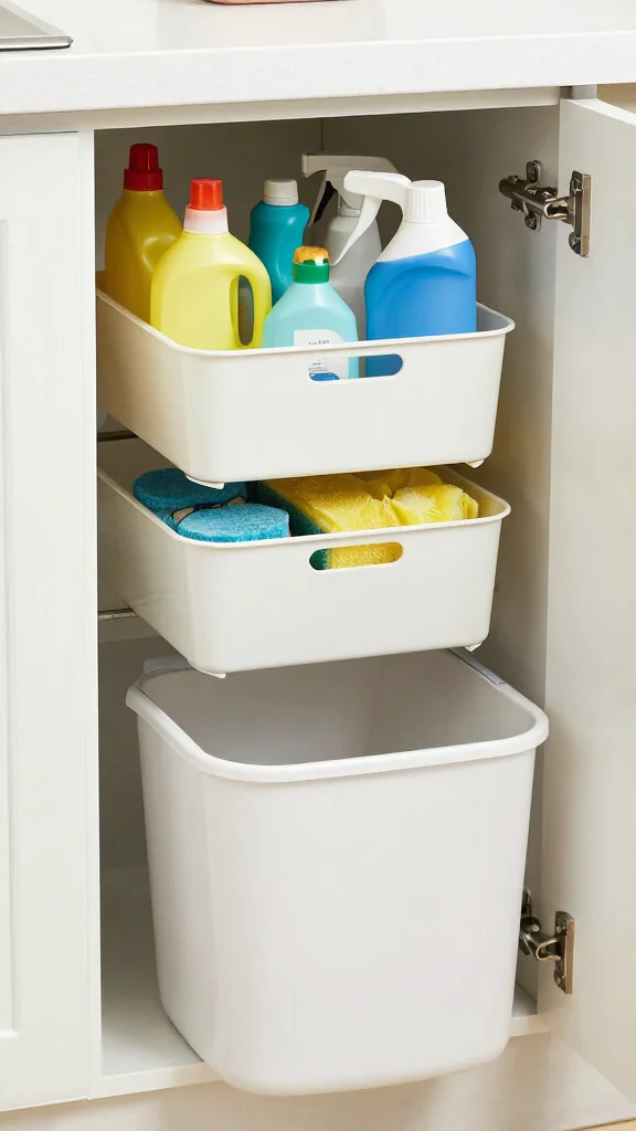 To maximize this space, use stackable bins to separate and categorize items effectively. Consider adding a pull-out trash bin to maintain a clean look, and install shelves if there’s enough height for additional storage.