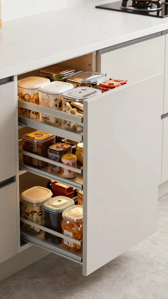 – Pull-Out Pantry Drawers: Make use of narrow spaces by installing pull-out drawers that can store canned goods and dry ingredients neatly.