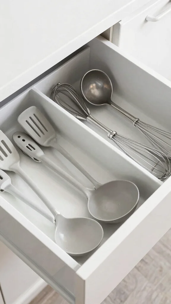 Drawer dividers are essential for maintaining organization in your kitchen utensils. With a well-organized drawer, you can easily access your tools, enhancing the spacious feel of your kitchen. Picture a tidy drawer where each utensil has its designated space, making cooking a breeze.