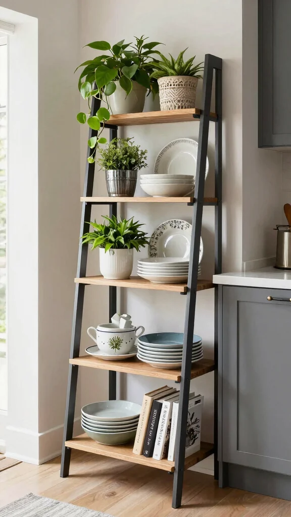 When using ladder shelves, place heavier items on the lower shelves for stability while decorating the upper levels with lighter, more decorative pieces. Keeping frequently used items on middle shelves ensures they are within easy reach.