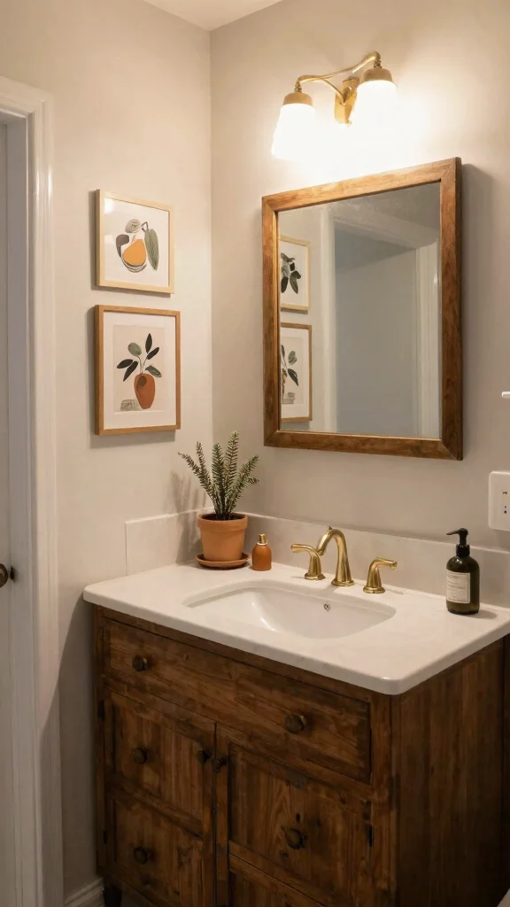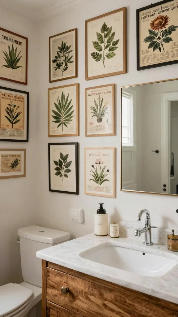 How can I incorporate vintage wall art into a small bathroom vanity area?