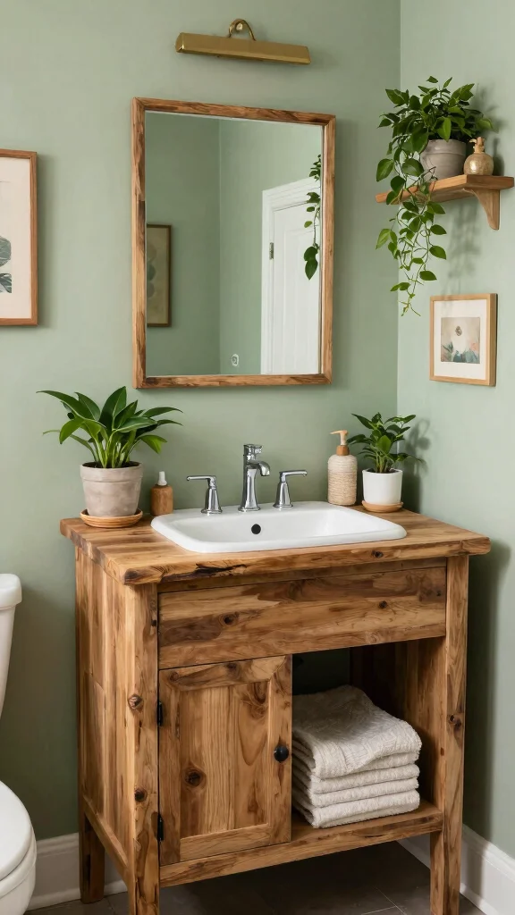Pairing these natural elements with vintage wall art enhances the rustic charm, creating a bathroom that feels both warm and welcoming. Look for low-impact paints and finishes that align with your eco-friendly approach, ensuring your space is both stylish and sustainable.