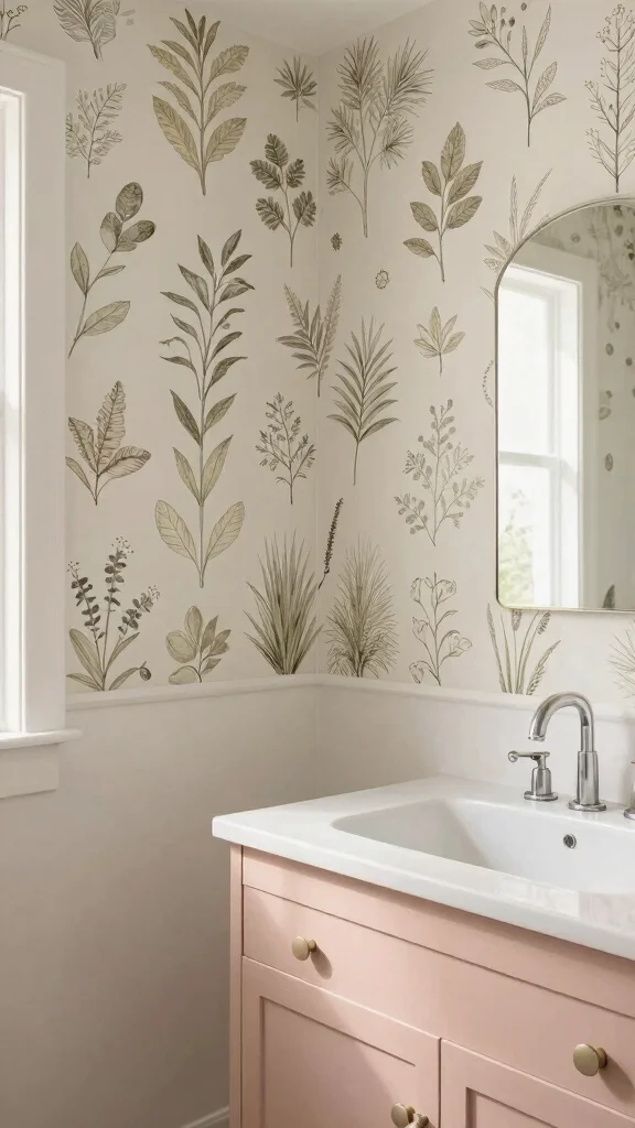 Choose decals that mimic vintage wallpaper designs or botanical themes to beautifully complement your vanity area. Strategic placement can draw attention to your vanity, especially when paired with soft lighting. This approach is ideal for those looking to personalize their space without committing to permanent changes.